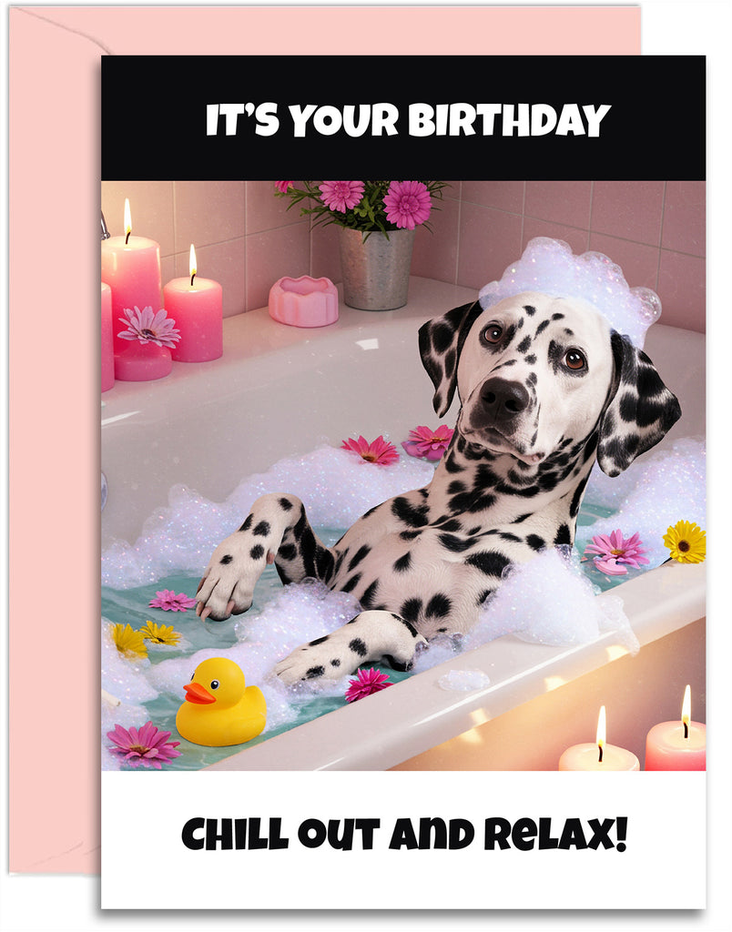 Dalmation Birthday Card - Chill out and Relax - A5 Size with Pink Envelope. Funny Card for her, mum, nan, auntie, sister, daughter. Designed and Printed in the UK