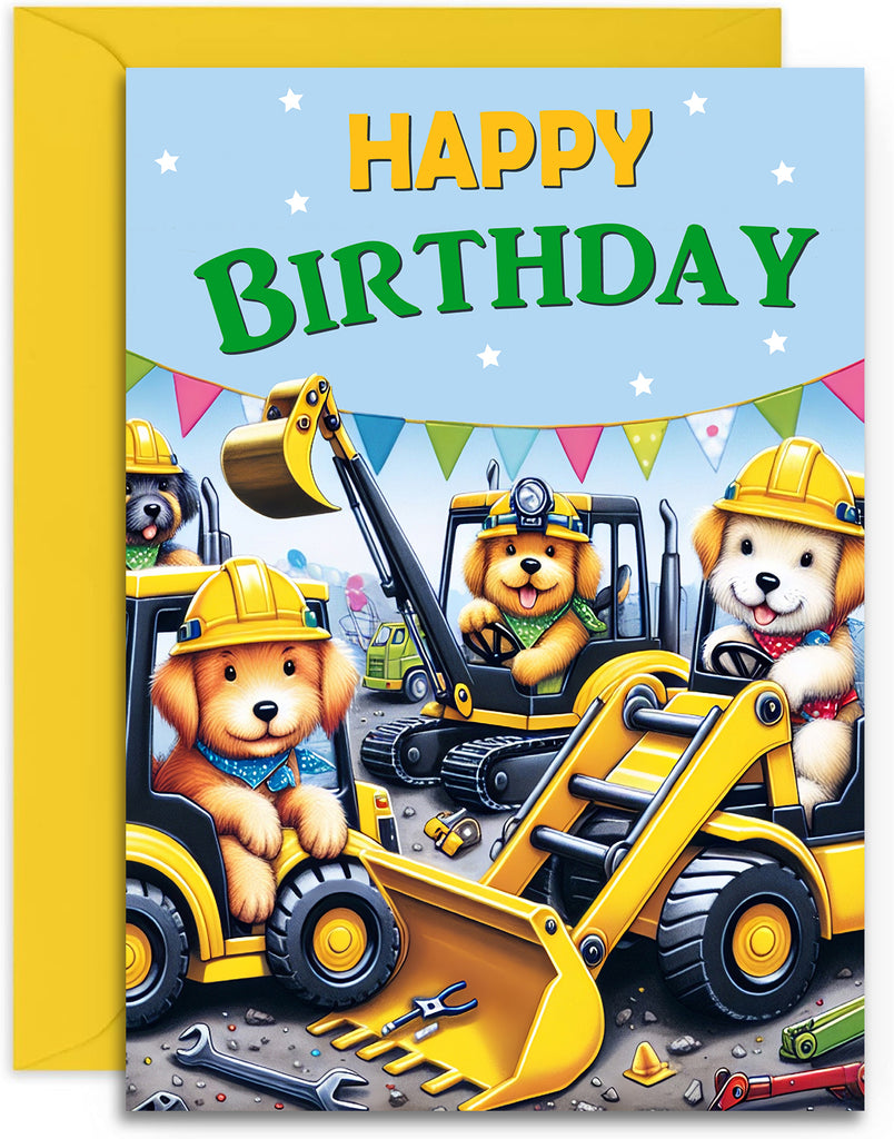 Digger Birthday Card - Doggy Digger Crane Design for Boy - A5 Size Card with Yellow Envelope