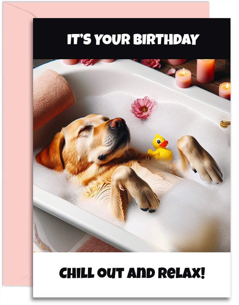 Golden Lab Birthday Card - Chill out and Relax - A5 Size with Pink Envelope. Funny Card for her, mum, nan, auntie, sister, daughter. Designed and Printed in the UK