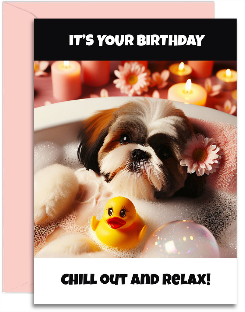 Shih Tzu Birthday Card - Chill out and Relax - A5 Size with Pink Envelope. Funny Card for her, mum, nan, auntie, sister, daughter. Designed and Printed in the UK