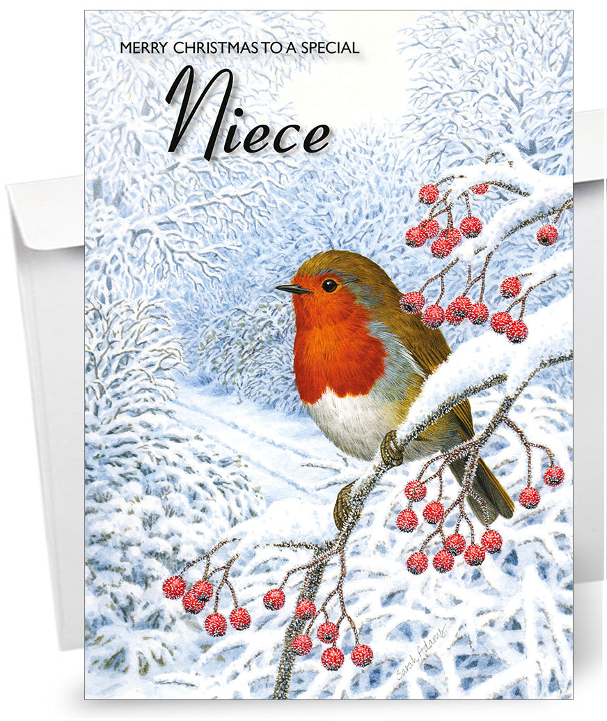 Niece Christmas Card (A5 Size). This card is produced from thick 300gsm quality card from sustainable sources and has a light sheen finish. The card features a pretty winter robin on a snowy branch with berries. Supplied with a quality envelope. Click the secondary image above to see the text printed inside the card. This design is part of a huge range of Christmas cards, birthday cards and social stationery from Olivia Samuel. Add the search term ‘Olivia Samuel’ to find other relationship Christmas cards in this range and many others.