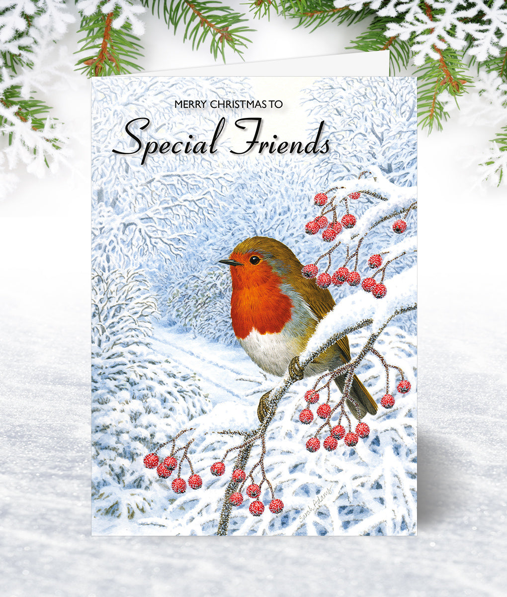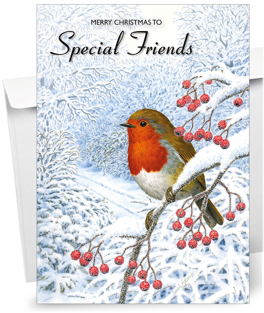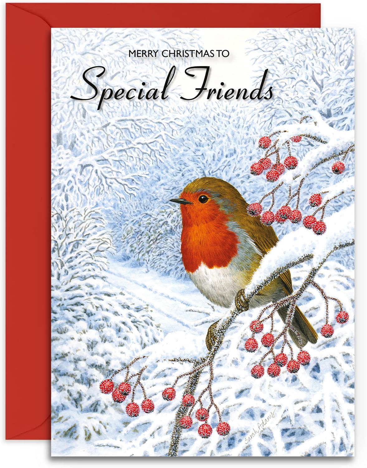Special Friends Christmas Card (A5 Size). This card is produced from thick 300gsm quality card from sustainable sources and has a light sheen finish. The card features a pretty winter robin on a snowy branch with berries. Supplied with a quality envelope. Click the secondary image above to see the text printed inside the card. This design is part of a huge range of Christmas cards, birthday cards and social stationery from Olivia Samuel. Add the search term ‘Olivia Samuel’ to find other relationship Christmas cards in this range and many others.