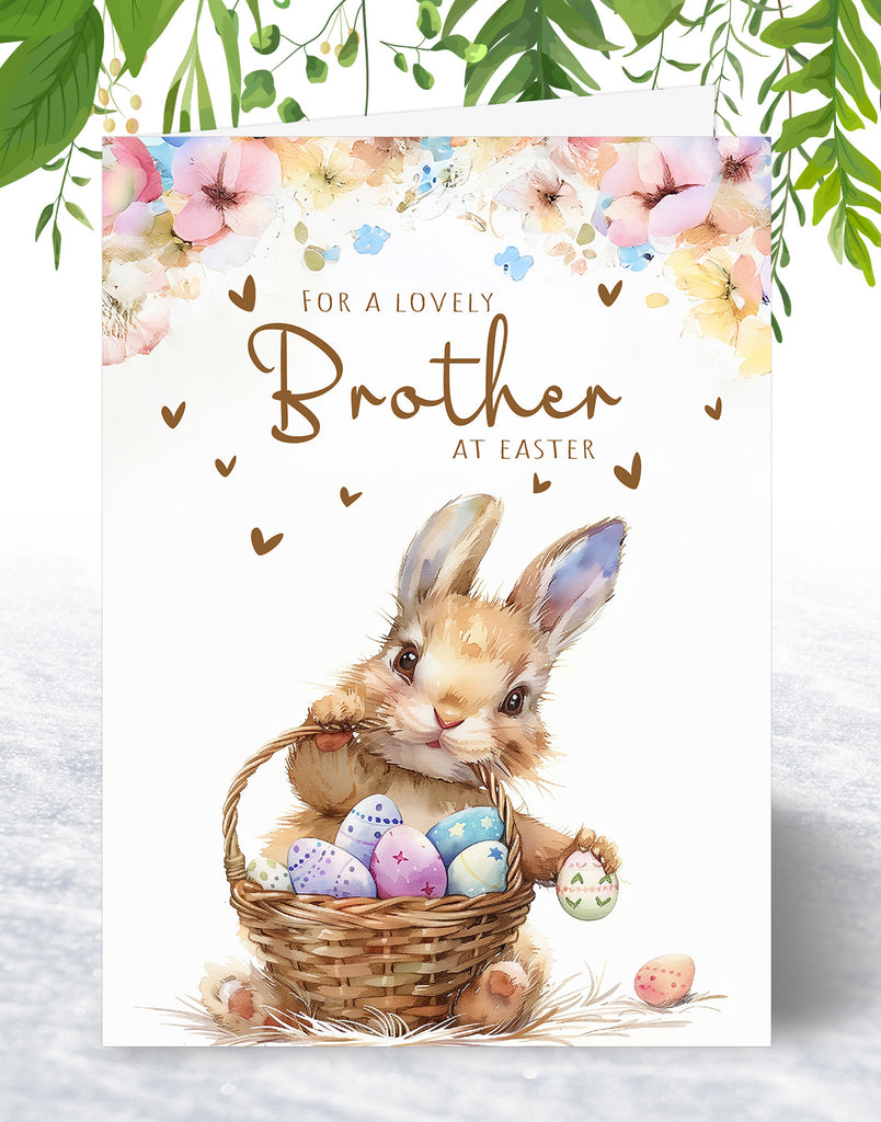 CHARMING BROTHER EASTER CARD ⭐ Delightful watercolour illustration featuring an adorable bunny holding a woven basket filled with beautifully decorated Easter eggs⭐ Click the second image for the text inside the card.