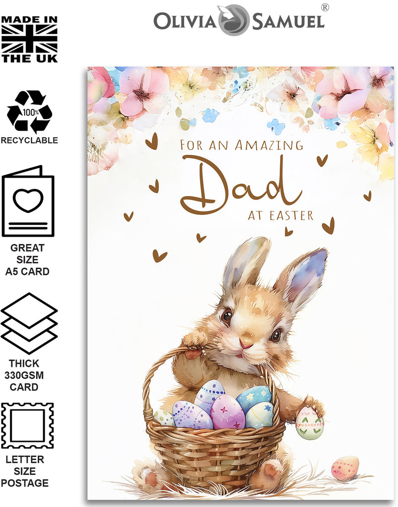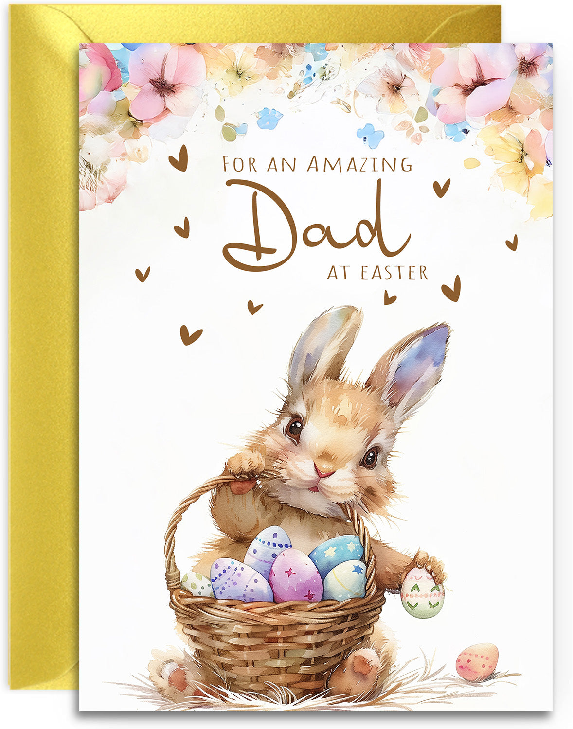 Dad Easter Card - Bunny with Easter Eggs Design - A5 Size with Gold Envelope