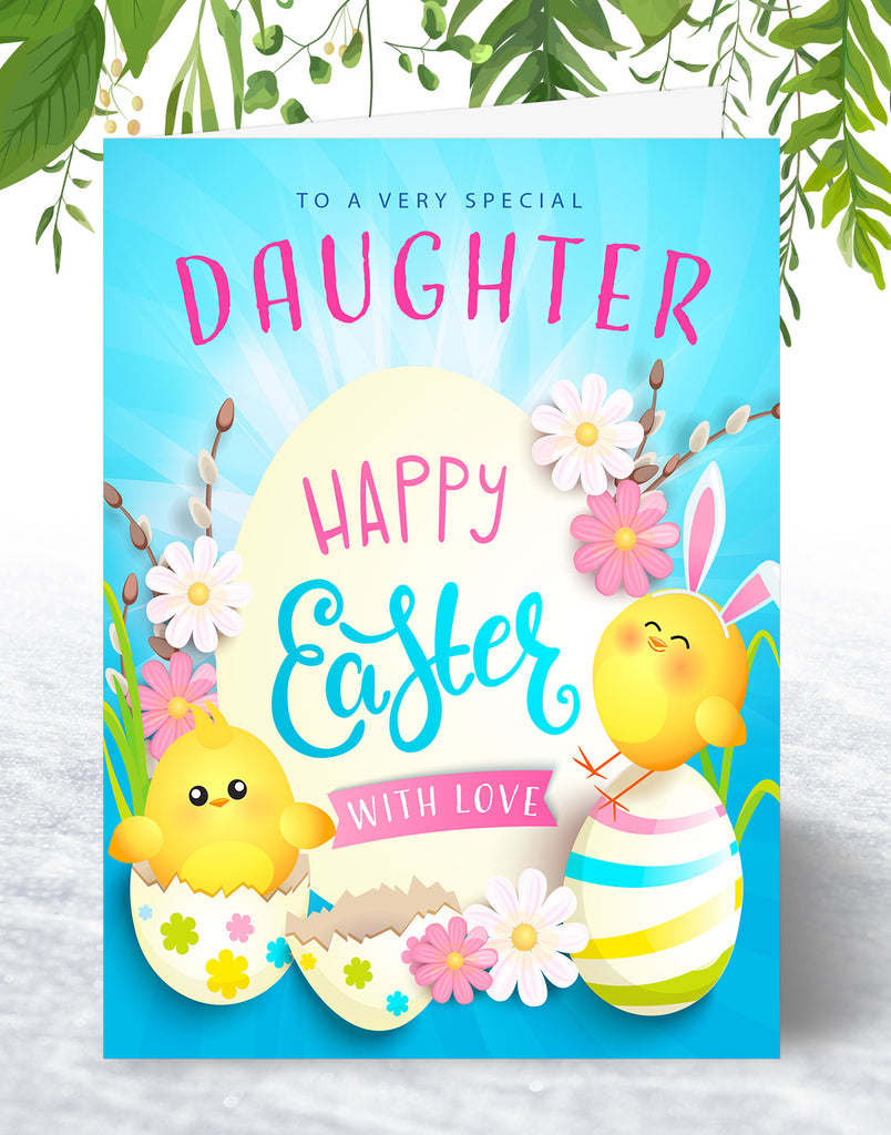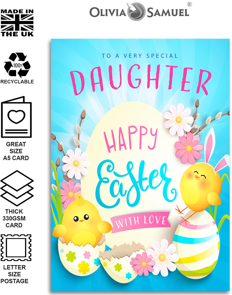 COLOURFUL DAUGHTER EASTER CARD ⭐ Vibrant Easter greeting card with adorable chick illustrations, decorative Easter eggs, and spring flowers⭐ Click the second image for the text inside the card.