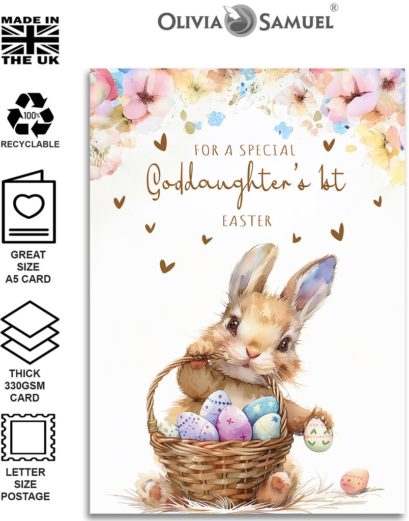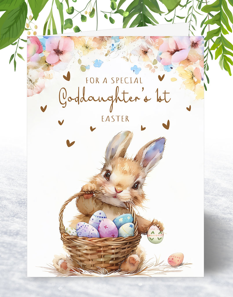 CHARMING GODDAUGHTER 1ST EASTER CARD ⭐ Delightful watercolour illustration featuring an adorable bunny holding a woven basket filled with beautifully decorated Easter eggs⭐ Click the second image for the text inside the card.