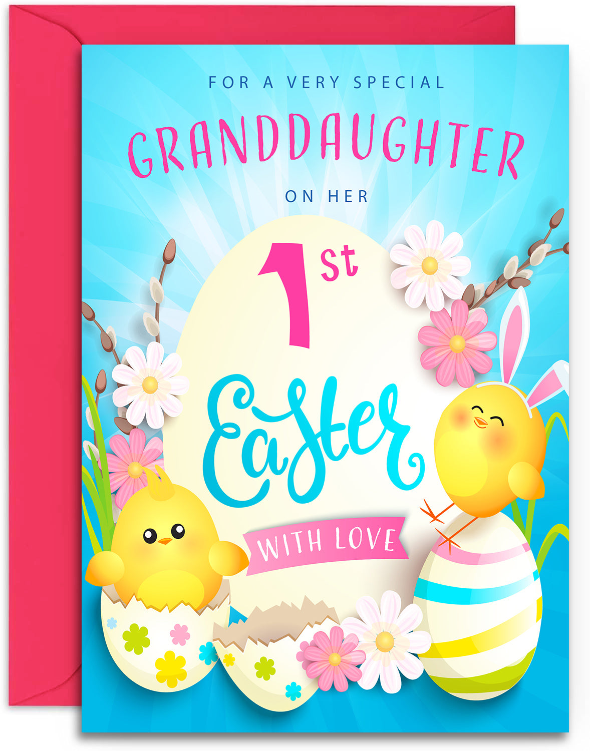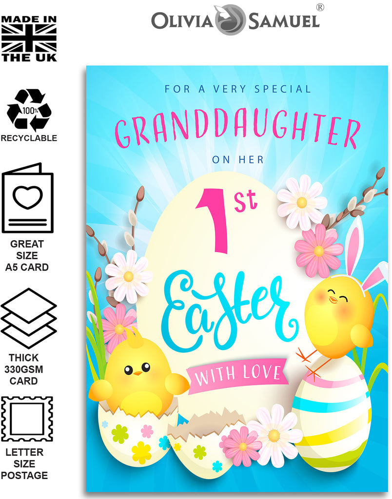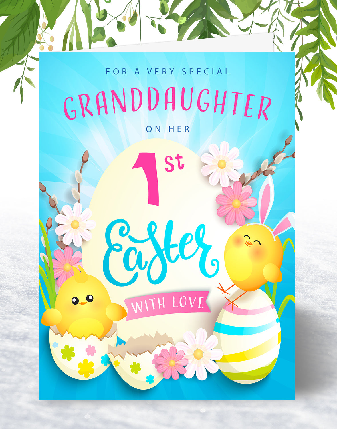 COLOURFUL GRANDDAUGHTER 1ST EASTER CARD ⭐ Vibrant Easter greeting card with adorable chick illustrations, decorative Easter eggs, and spring flowers⭐ Click the second image for the text inside the card.