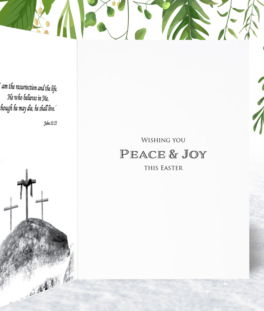 This card is produced from thick 350gsm quality card from sustainable sources and has a light sheen finish. The card features a Christian Easter scene and has a simple greeting inside of “Wishing you Peace and Joy this Easter”. The facing page has a bible inscription which reads : ‘I am the resurrection and the life. He who believes in Me, though he may die, he shall live.’ John 11:25. Supplied with a quality envelope. Click the secondary image above to see the inside the card. This design is part of a huge range of Easter cards, Christmas cards, birthday cards and social stationery from Olivia Samuel. Add the search term ‘Olivia Samuel’ to find other relationship Easter cards in this range and many others.