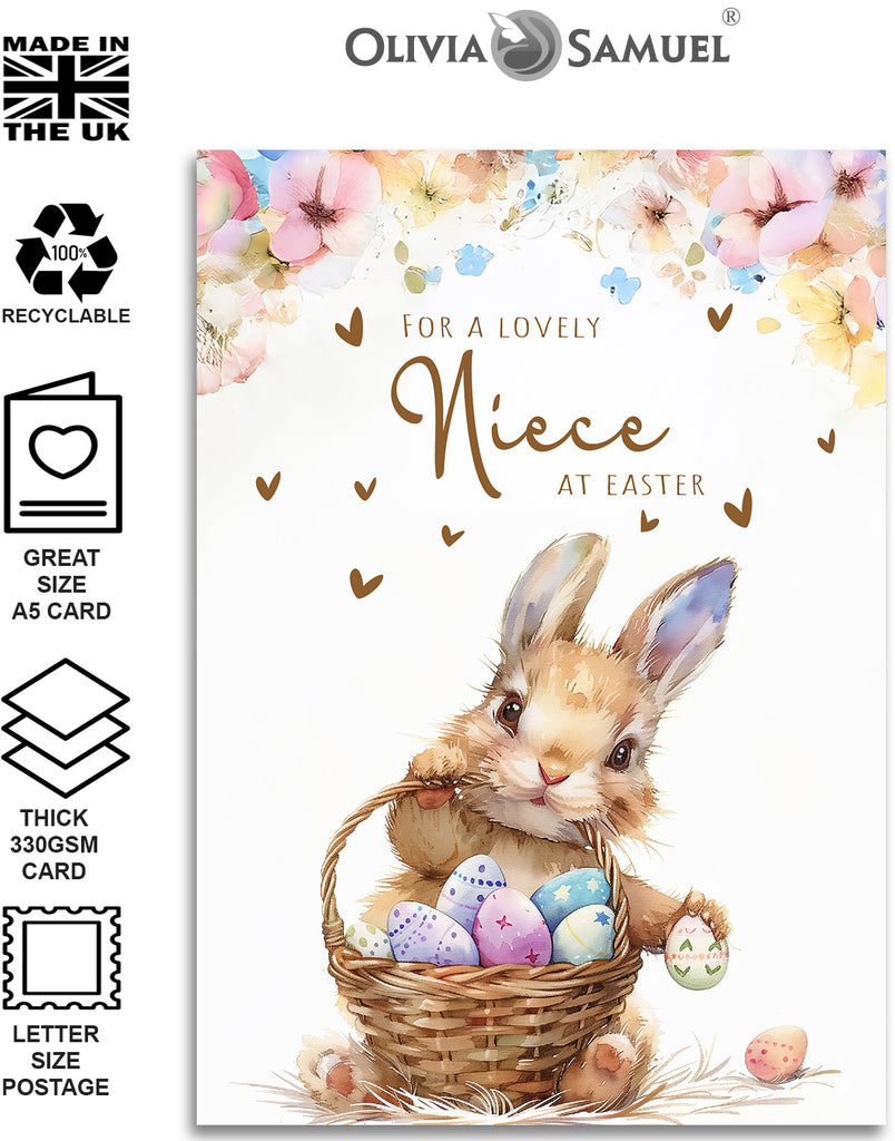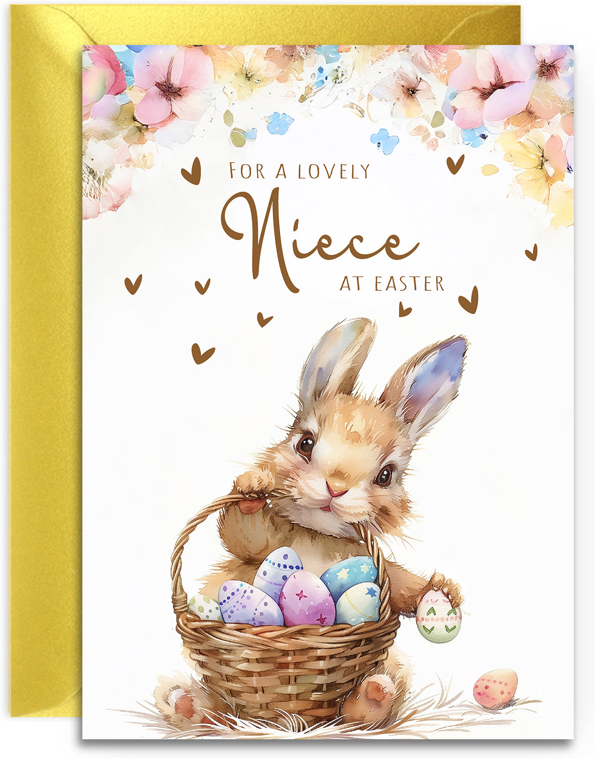 Niece Easter Card - Bunny with Easter Eggs Design - A5 Size with Gold Envelope