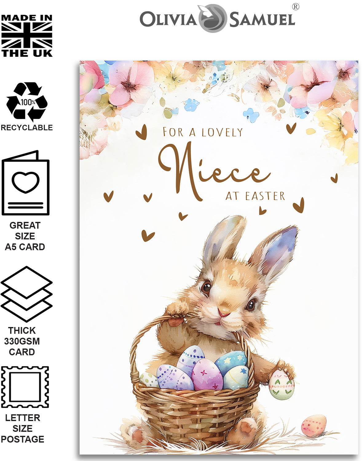 CHARMING NIECE EASTER CARD ⭐ Delightful watercolour illustration featuring an adorable bunny holding a woven basket filled with beautifully decorated Easter eggs⭐ Click the second image for the text inside the card.