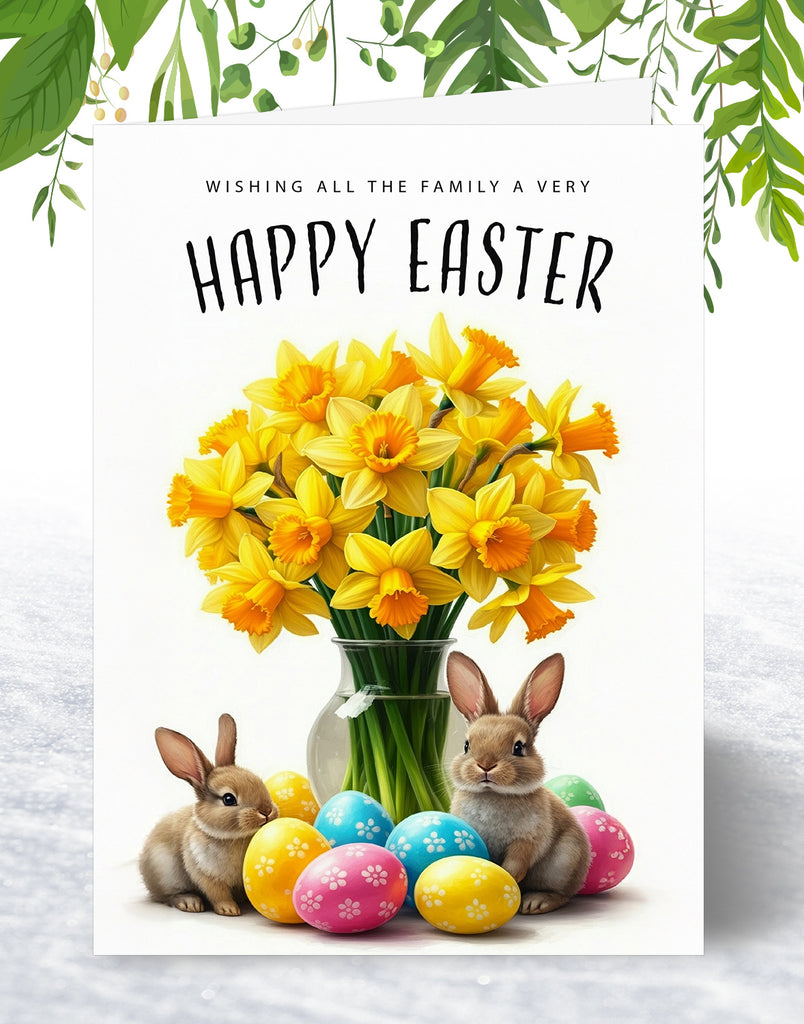 TO BOTH OF YOU EASTER CARD ⭐ Beautiful Easter greeting card featuring vibrant daffodils in a glass vase, adorable bunnies, and decorative Easter eggs⭐ Click the second image for the text inside the card.