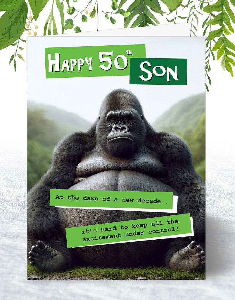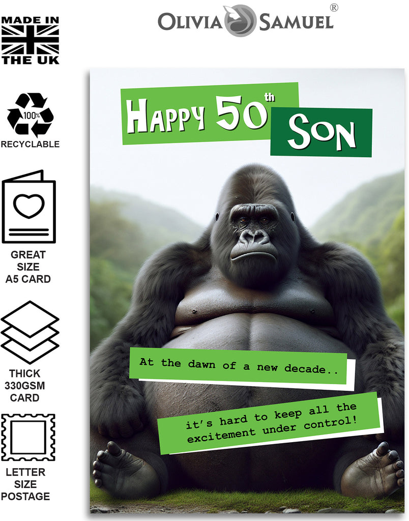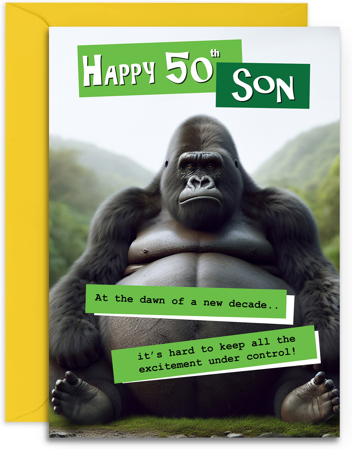 Funny Son 50th Birthday Card - Grumpy Gorilla Design for Him - Fun Age 50 Happy Birthday Card for Son - A5 Size Card with Yellow Envelope is backordered and will ship as soon as it is back in stock.