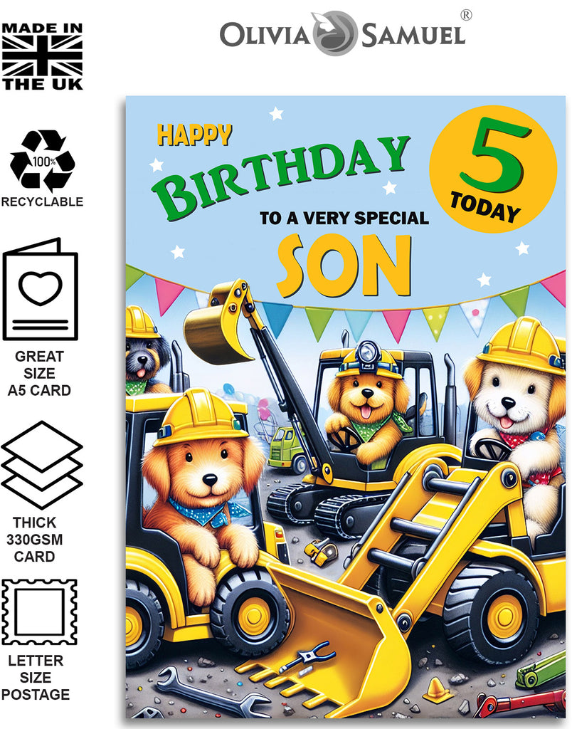 SON KIDS DIGGER 5TH BIRTHDAY CARD ⭐ Fun colourful digger construction design with adorable doggies ⭐ Click the second image for the text inside the card.